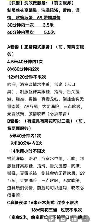 服务项目 全套,鸳鸯浴,口爆,毒龙,做爱,胸推,69,SM,按摩,舌吻,颜射,制服诱惑