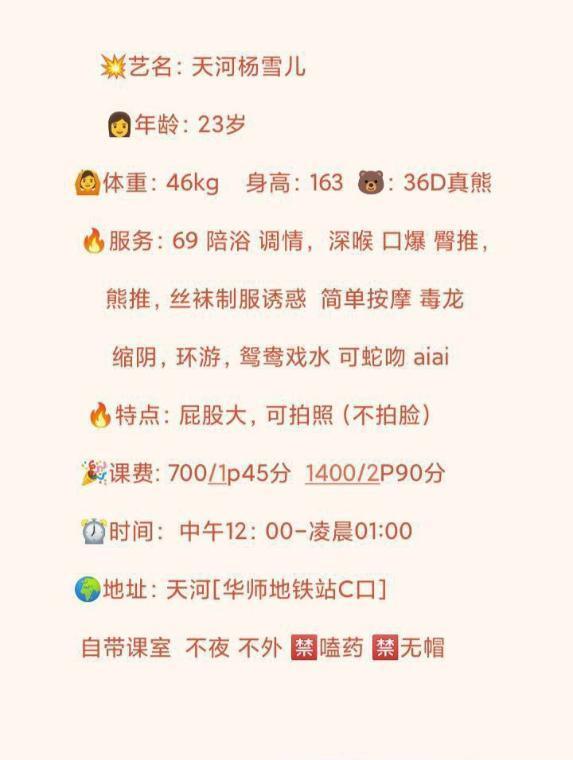 全套服务系的妹子,性格很好,聊天不冷场,个人觉得妹子的真人是比照片好看的,而且身材也是前凸后翘蜜桃臀,价格方面天河这边都不算便宜,700/p的价格还算可以,课表上的服务也都做了一遍,总体来说还是很满意的。